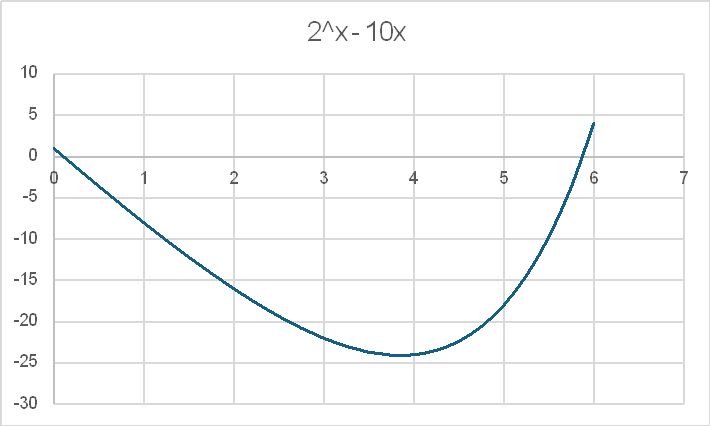 A quick plot of the function 2^x – 10x shows that there are solutions at x just greater than 0 and just less than 6: