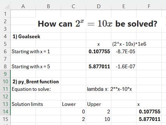 The py_Brent function requires an input lower and upper bound for the solution, which must evaluate to values with different signs, and a text function in Python lambda format. Note that exponentiation must be in Python format (**), rather than ^.