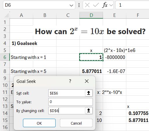 The required inputs are an initial guess of the ‘x’ value and the function to be solved. In this example, since we are looking for the x value to make the function zero, I have multiplied it by 1 million for greater precision. Goal Seek adjusts the value in cell D6 to make cell E6 very close to zero: