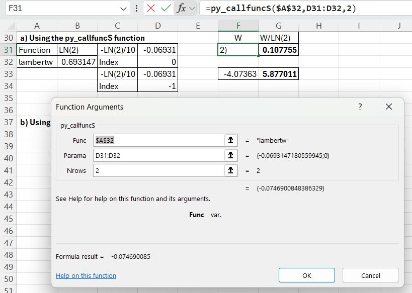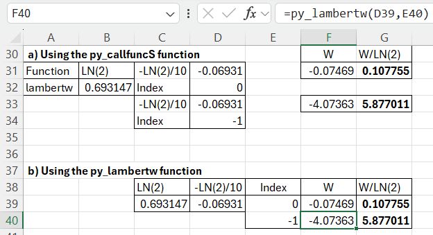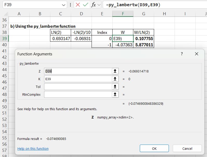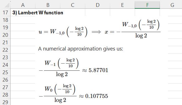 The required input is the function name (lambertw), the function input value and output index (0 or -1), entered in a column, and the number of input rows. The returned value is divided by LN(2) to find the required results.