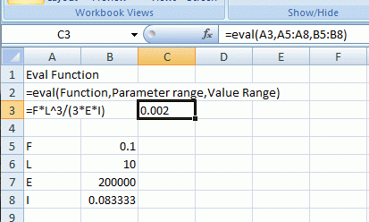 Function Eval(form As String, RepA As Variant, ParamA As Variant) Dim Eform As String, i As Long GetArray RepA GetArray ParamA Eform = form For i = 1 To UBound(RepA, 1) - LBound(RepA, 1) + 1 Eform = Replace(Eform, RepA(i, 1), ParamA(i, 1)) Next i Eval = Evaluate(Eform) End Function