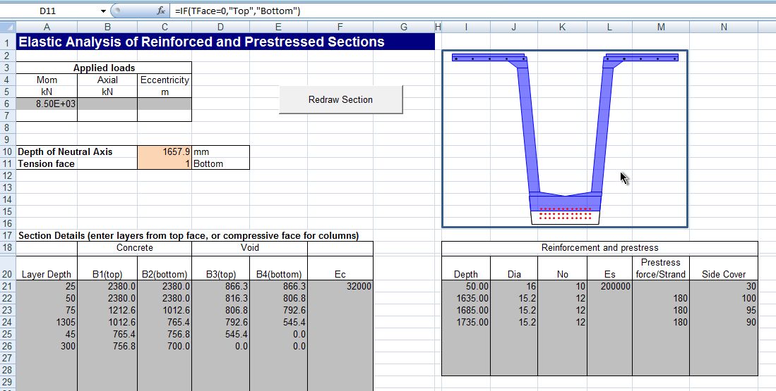 The theory presented in the previous 2 posts in this series has been incorporated into an Excel UDF, allowing concrete and reinforcement stresses and strains to be evaluated quickly and easily for reinforced and prestressed members of complex cross-section, subject to combined bending and axial load.
