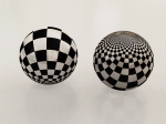 A pair of spheres in black & white checks, one sitting on its North pole, the other sitting on its South pole.