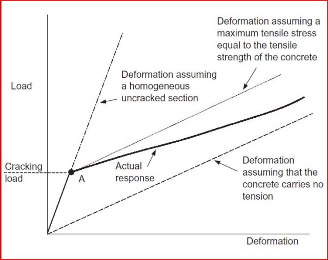 - After cracking there is a transfer of stress from the reinforcement to the concrete between the cracks, and this results in a significant increase in stiffness.