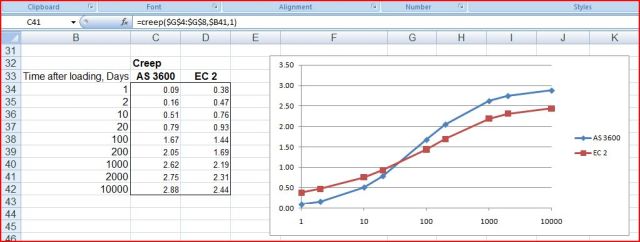 The UDFs Shrink() and Creep() have been added to the RC Design Functions6 spreadsheet.  These functions provide estimated shrinkage strain and creep coefficients to either the Australian Standard Concrete Structures Code (AS 3600) or the Eurocode Concrete Code (EC2).  A third UDF, AdjustedAge() calculates the adjusted age of a concrete section according to EC 2, based on the time/temperature history.  This age can be used as input to the Creep function.  As usual, the spreadsheet includes open source code for the UDFs.