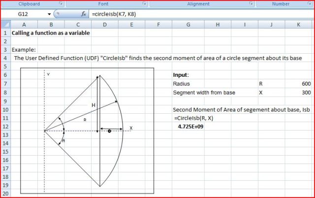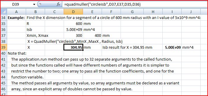 An example of this method is given in the file PassFunc.xls, which as usual includes full open source code. The file includes an amended version of the QuadMuller function (and the associated SolvexM function), and a function to evaluate the second moment of area of a segment of a circle about its base, given the radius of the circle and the width of the segment: