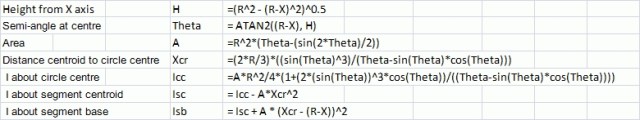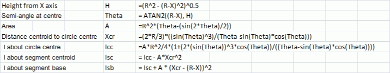 The formulae for the segment area properties are taken from the Section Properties spreadsheet (version for Excel 2003 and earlier).