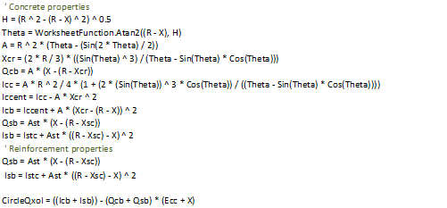The recent posts on the Inverse Quadratic Method and Brent’s Method, and on calling a function as a variable, are leading towards a user defined function (UDF) to analyse circular reinforced concrete sections under combined bending and axial load, but since these methods are of general use, and (strangely) not everyone is interested in reinforced concrete, this post will look at how these methods are used to solve a complex equation, and the specifics of reinforced concrete beam bending theory will be saved for another post. A spreadsheet with full open source code of the functions discussed here may be downloaded from DepthNA.zip