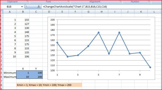In the following discussion John Walkenbach linked to an earlier solution that those who like to keep things simple may prefer. This is a user defined function (UDF), that returns no data, but modifies the y-axis limits of any named chart. It should be noted that this solution only works in Excel 2007 and later, is undocumented, and is not supposed to work at all, so use with caution. I have taken the liberty of modifying John’s code so that the limits of both the X and Y axes can be linked to cell values, the axes limits can be re-set to automatic, and the status of each axis is returned by the function. The revised code and a screen shot are given below.