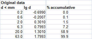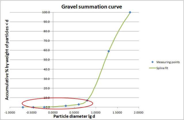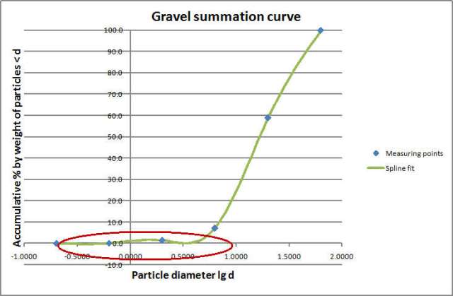 In defense of the method of adding additional data points, the end result is much the same as adjusting the slope of the tangents at the original data points. Also in this case the data is a cumulative frequency curve describing the grading of a sample of sand, so the data points would have considerable variation from sample to sample anyway. Certainly for other applications where the data is expected to fit a specific mathematical function it’s not a good idea to use a cubic spline to force the curve exactly through each data point.