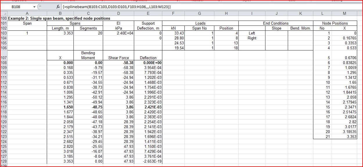 I have modified the SplineBeam spreadsheet to allow input of a single span (simply supported or with end constraints), and to optionally allow input of the position of intermediate nodes, rather than dividing each span into equal segment lengths. This allows loads to be applied at their precise location, and output of results at the point of maximum deflection.
