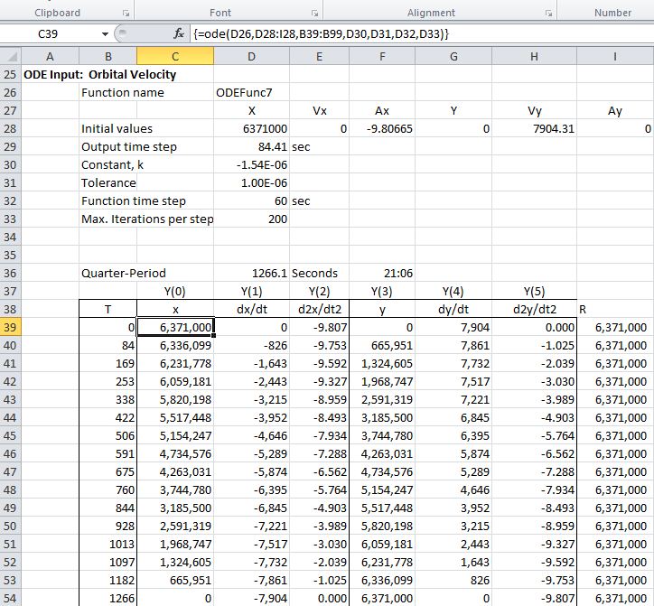 The Y offset and acceleration in the Y direction are initially set to zero. In order to check the output the Y velocity was set to orbital velocity. The output results show a path following the surface of the Earth exactly, indicating that the ODE solution to the problem is providing accurate results: