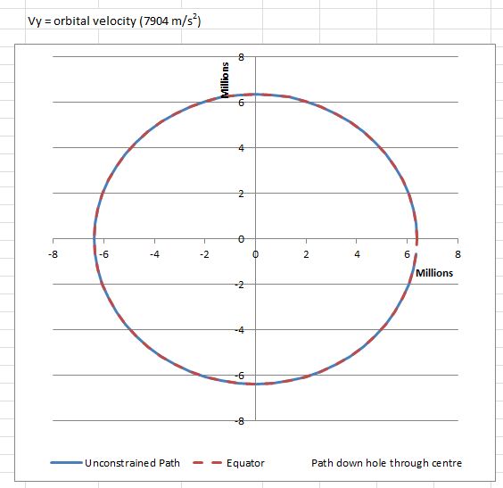 Finally the initial Y velocity was set to the surface of the Earth (463 m/s), modelling the situation when an object is dropped into a vertical hole at the Equator, with no horizontal velocity, relative to the Earth’s surface. The results are shown below. The blue line shows the path that would be followed if the object was unconstrained, and the green line the path followed if the object was constrained by the frictionless sides of a rotating hole.