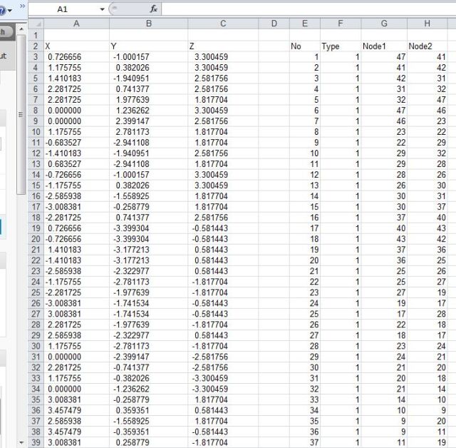 The problem then was, how to connect them. The information was probably somewhere at the same site as the coordinates, but not in a form I could understand, so I pasted the coordinates into Strand7, and connected the nodes by trial and error, until I got what I wanted. The list of node connections could then easily be copy and pasted into Excel: