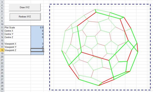 It was then a simple matter to paste the coordinates and connection details onto my Plotxyz spreadsheet, press the Draw button, and hey presto – one Buckyball: