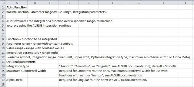 In a comment on a previous post on numerical integration I mentioned that I might implement the ALGLIB integration functions using the same technique, that is using the VBA Evaluate function to evaluate functions entered as text in the spreadsheet. Well here they are. The spreadsheet provides both an efficient high precision integration technique, and a good example of the use of the VBA Evaluate function.