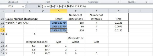 The ALGLIB functions use the Gauss-Kronrod method, which is a variant of the Gaussian method used in previous versions of this spreadsheet. The advantage of the Gauss-Kronrod method is that the integration points from previous iterations are re-used in successive iterations, thus saving a significant number of time consuming evaluations. The spreadsheet with full open source code can be downloaded from Eval.zip