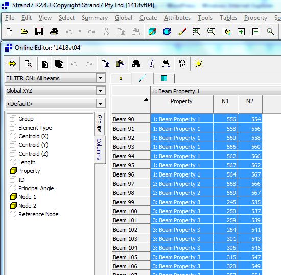 The screen shot below shows the Strand7 on-line editor displaying beam details. The details to be displayed may be selected in the “Columns” tab, and for the present purposes the only ones required are the beam property type and the two end node numbers. Having selected these columns for display the data may be selected using Ctrl-A and copied to the clipboard with Ctrl-Shift-C (or Ctrl-C to copy without beam numbers and column headers).