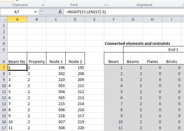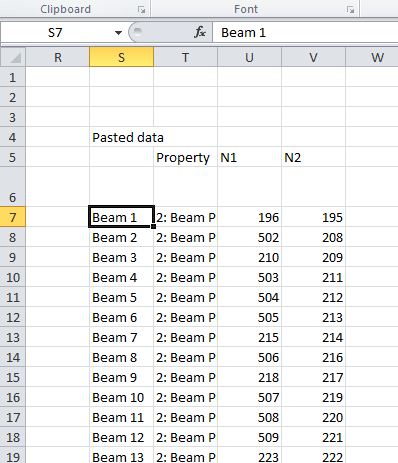 Note that the beam numbers and property types are pasted as text strings, rather than numbers. The required values may be extracted with a simple string formula: