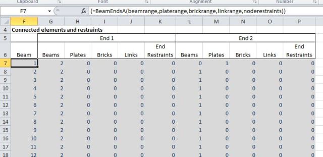 Note that the function returns an array with 1 row for each beam in the input range, and 11 columns and must be entered as an array function: