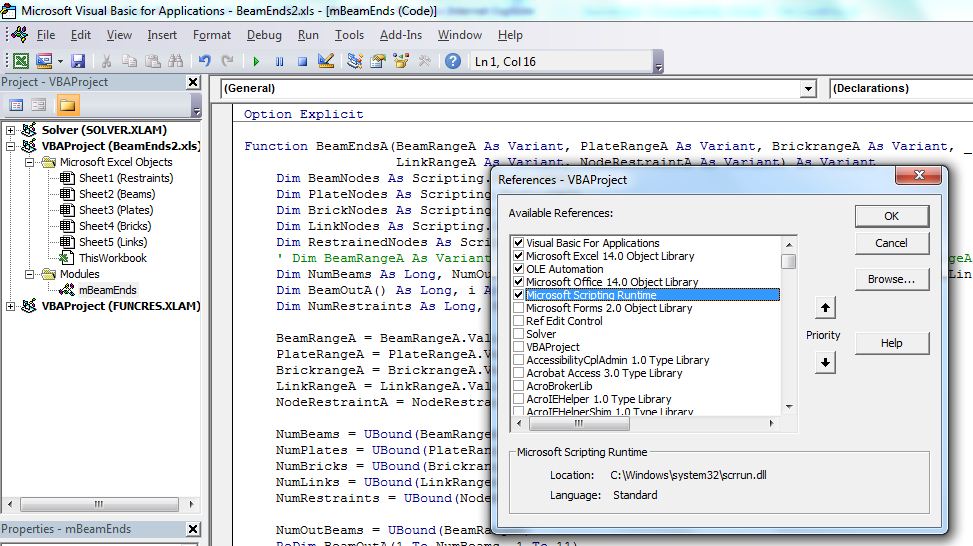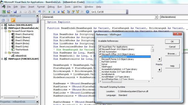 Having imported the data into Excel the nodes defining each element are read into a “dictionary object”. The advantage of the dictionary object is that it has an “exists” method allowing the presence of any specific node in a list to be determined quickly and efficiently. The dictionary object is part of the Microsoft Scripting Library, which is not enabled by default. The library must therefore be selected in the Tools-References dialog of the VBE, as shown below: