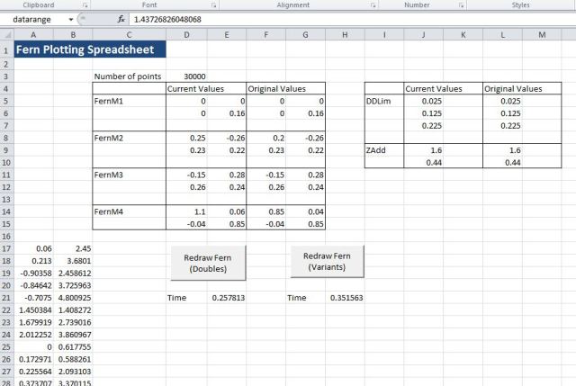 • The fern shape is governed by a four 2×2 matrices which were hard coded.  I also changed these to be read from the spreadsheet, so that it was easy to experiment with different parameters.
