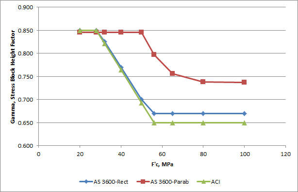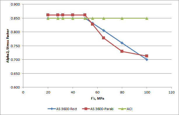 It can be seen that both factors are in close agreement for the two codes up to 50 MPa, but diverge significantly for higher strength grades. The curves for the parabolic-rectangular stress block are significantly different for the lower strength grades, but closer to AS 3600 for higher strengths.