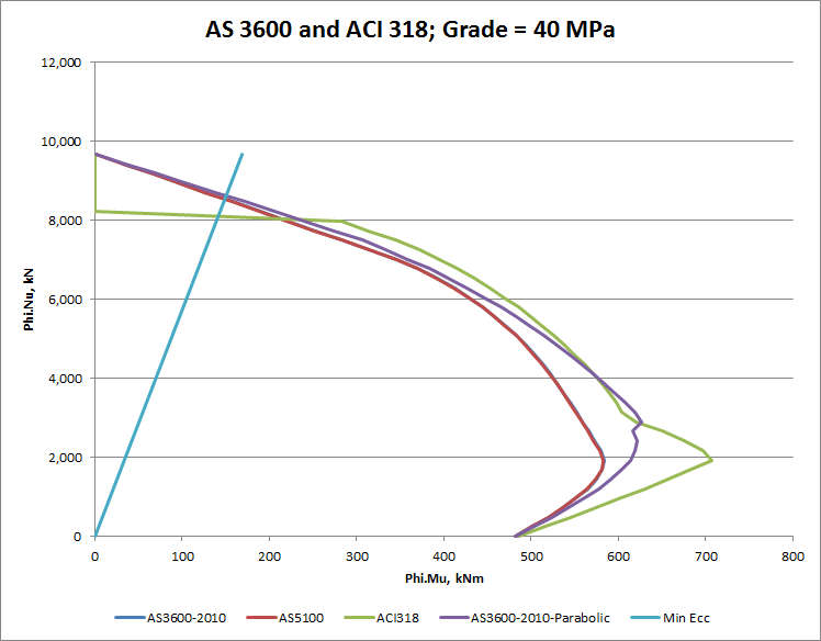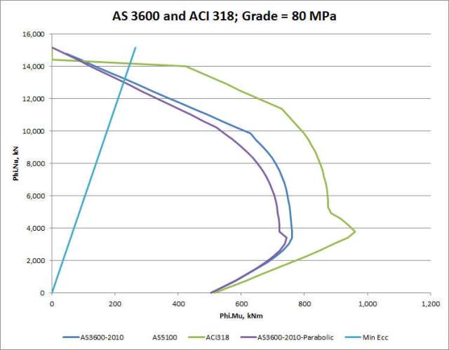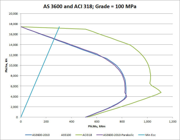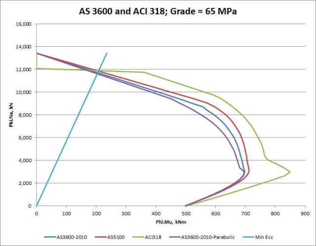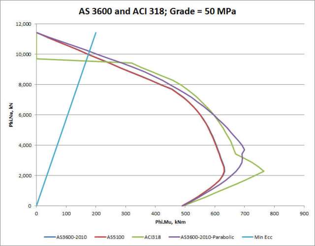 - For higher axial loads the results of the two codes are similar for strength grades up to 50 MPa. The ACI code gives slightly higher values than the AS 3600 rectangular stress block (because the strength reduction factor is higher), but the results from the parabolic stress block with AS 3600 factors are very close to the ACI values.