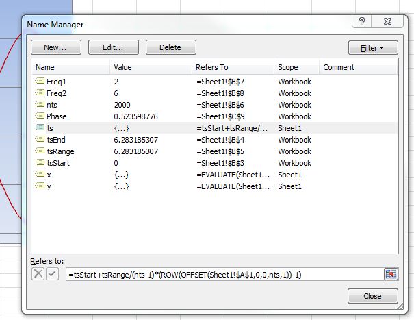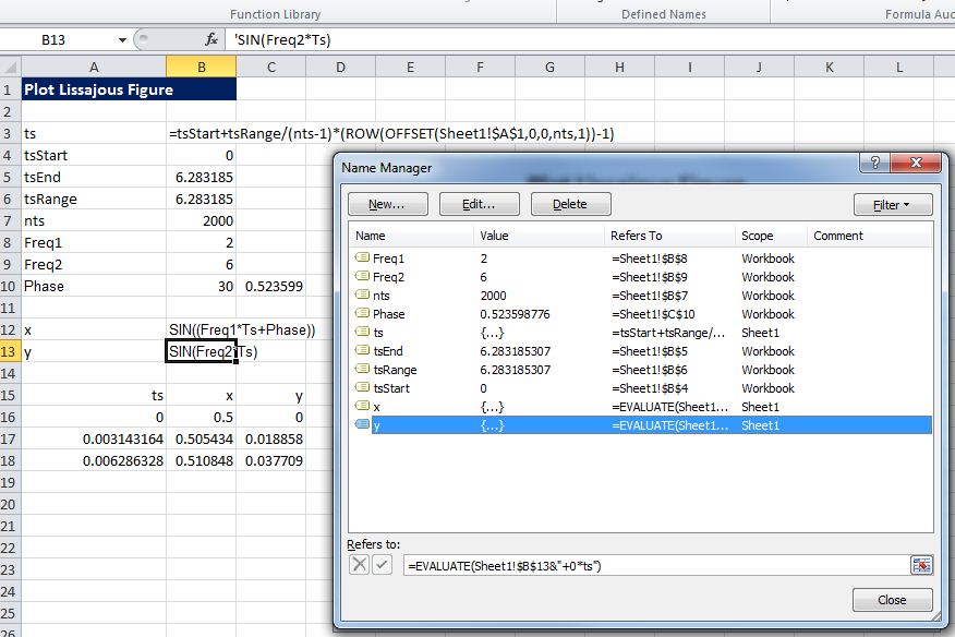 - The name definitions use the Evaluate function (=EVALUATE(Sheet1!$B$12&”+ts*0″)), and are terminated with the strange looking sequence: “+ts*0”. This is a workaround required when the function to be evaluated includes any Excel function (in this case the SIN function)