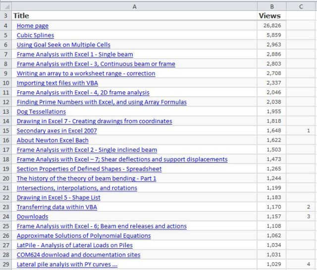 Of the 2010 posts, the most popular overall was Secondary axes in Excel 2007. The most popular in the Newton category was Lateral pile analyis with PY curves …, and the most popular in the Bach category was coffeescup a.k.a. lemonflower