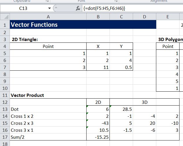 In addition to Dot and Cross the spreadsheet contains the following vector related functions (optional function arguments are shown in italics):