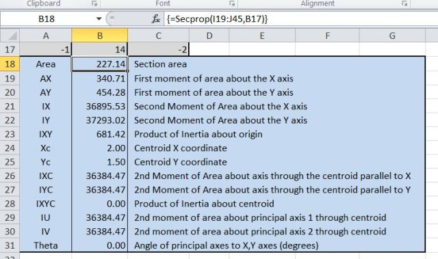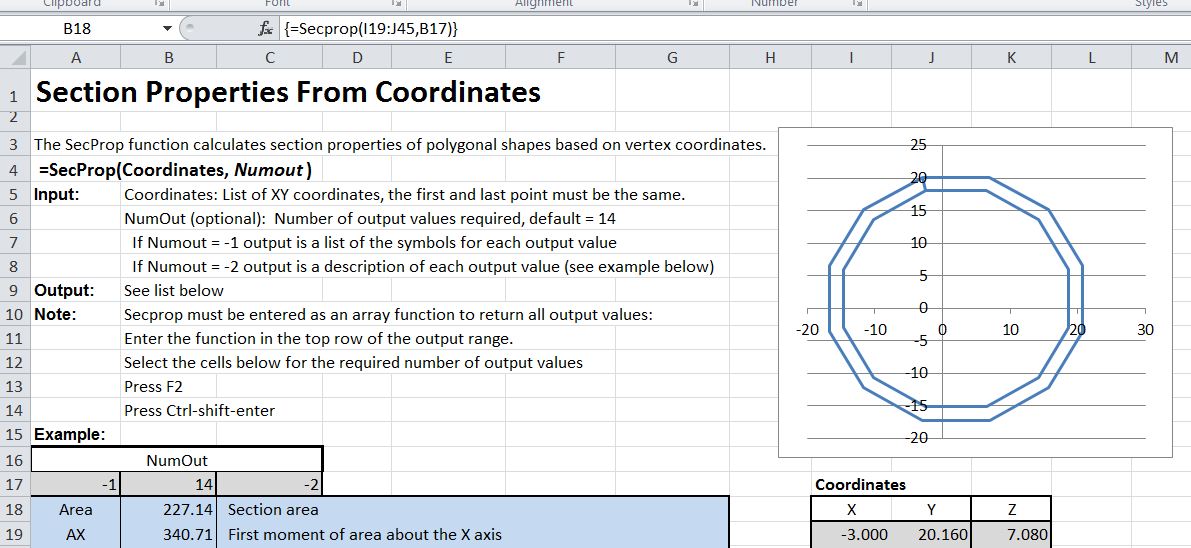 The previous post looked at User Defined Functions (UDFs) for working with vectors, including examples of functions to find the area of polygons defined by coordinates. In this post the functions will be extended to find other section properties (such as first and second moment of area), and compared with the functions presented previously in Section Properties07.xlsb. The new functions (including full open source code) can be downloaded from: SecPropV.xlsb. The new function returns up to 14 values as an array function; refer to Using Array Formulas if you are not familiar with their use.