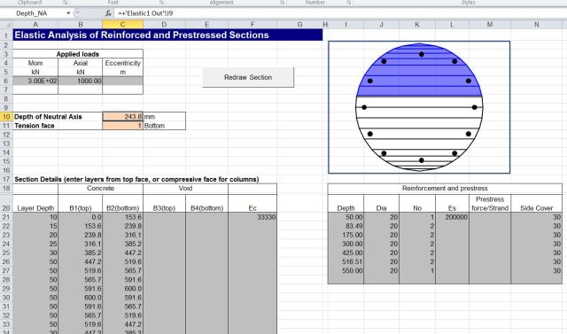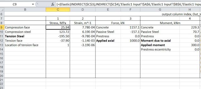 “Beam Design Functions” is an Excel spreadsheet providing a User Defined Function (UDF) that will calculate the stresses, strains, forces and moments in a reinforced or prestressed concrete section subject to any specified bending moment and axial load, using an elastic analysis.  The only restriction is that the section must be symmetrical about the vertical axis (i.e. the axis perpendicular to the axis of bending). The spreadsheet may be downloaded from: Beam Design Functions.zip