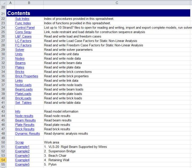 Strand7 is a general purpose Finite Element Analysis program, which has an Application Programming Interface (API), allowing external programs to interact with Strand7, including reading and writing to data files, running analyses, and reading the results. The API is a comprehensive program, allowing control of almost all aspects of the software, but it is also very complex. The manual consists of over 1000 pages of detailed technical information for instance. To make the API more useable in a design environment I have written an Excel based front end, allowing the main functionality of the API to be accessed without programming, through a series of VBA routines and User Defined Functions (UDF’s). A demonstration version of this spreadsheet may be downloaded from S7 API Tools.zip. Unlike the other software on this site, this spreadsheet is intended for demonstration purposes only, and all the VBA code is hidden. Future post on this blog will however cover the main elements in setting up an API application, including open source code.
