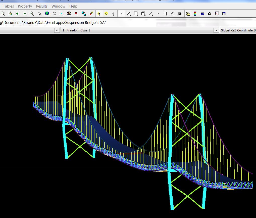 The following screen shots illustrate the process of importing a Strand7 data file (using the Suspension Bridge example included in the Strand7 Bonus Models pack), modifying the properties of the main suspension cables over a range of values, running the analysis and importing deflection results into Excel: