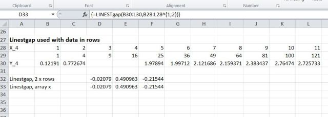 This must be typed as shown, then entered into the spreadsheet by pressing Ctrl-shift-enter, when it will display as {=LINESTgap(B30:L30,B28:L28^{1;2})}.