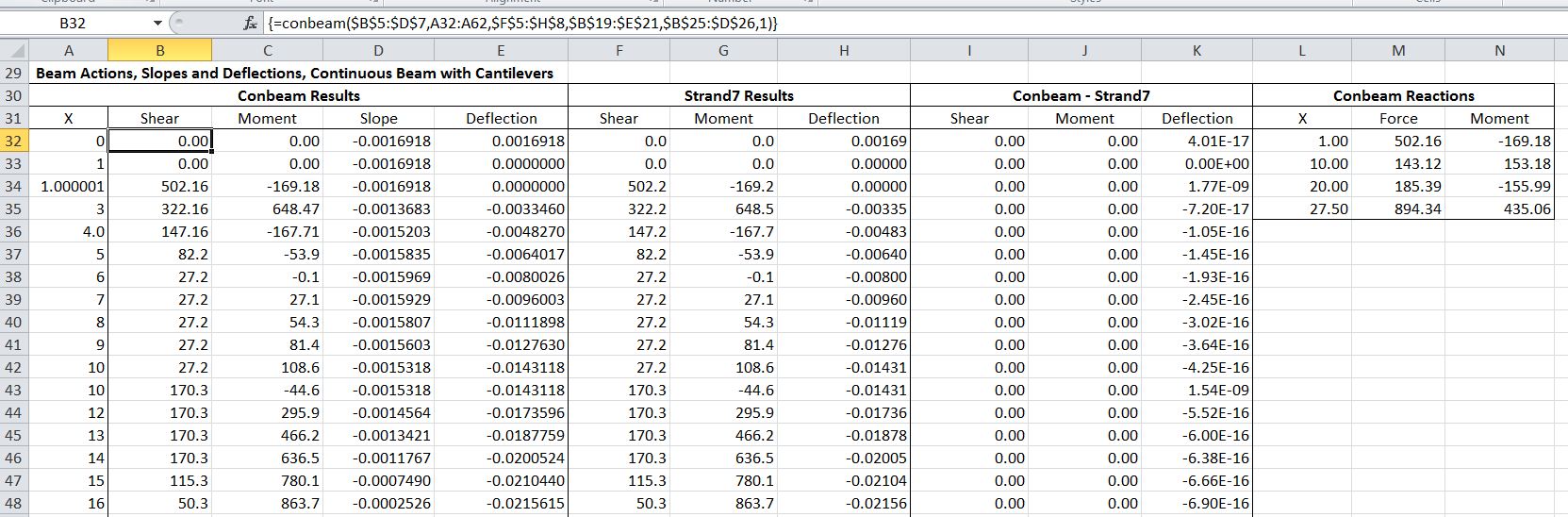 The screenshots below show an example (included in the download file) of a three span beam with spring supports and shear deflections included, compared with output from the Strand7 FEA program. It can be seen that there is near exact agreement for both beam actions and deflections.