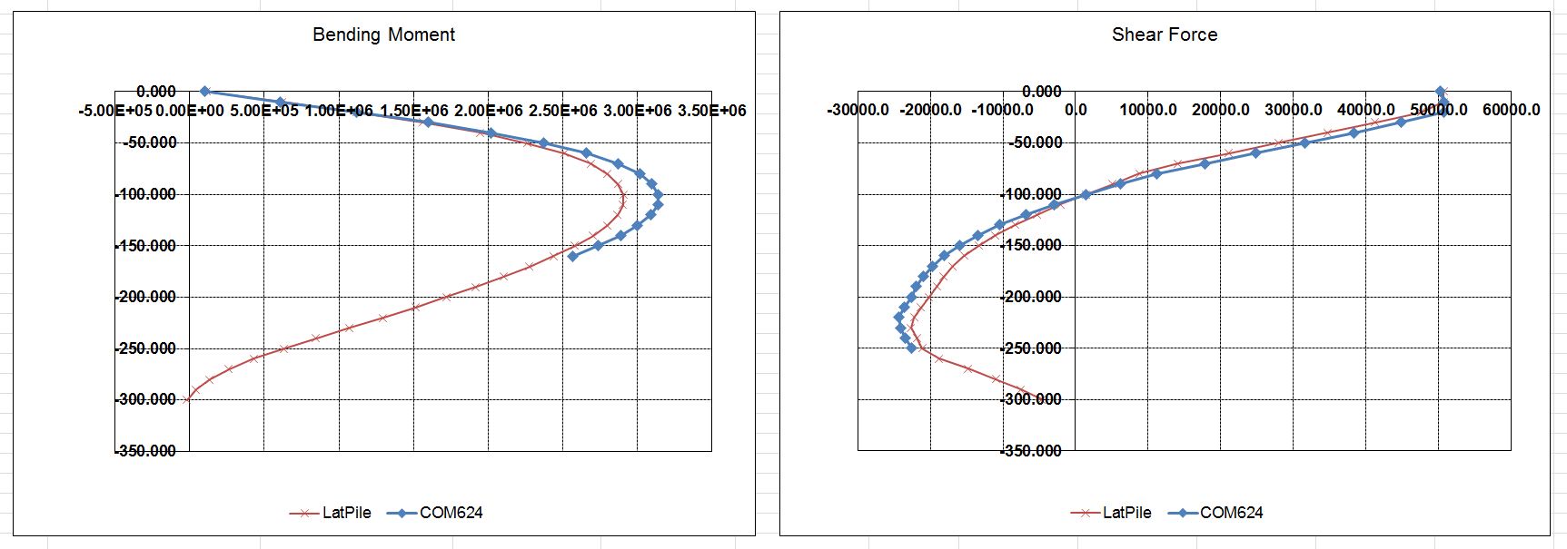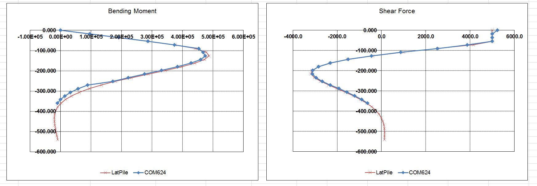 In spite of the different method of application of the stiffness from the PY curves, the spreadsheet shows good agreement with the COM624 results:
