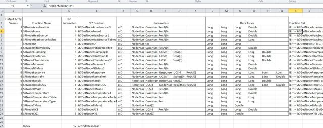 The first stage is to tabulate the names and data types of the required function parameters, and the size of any output arrays. For the Strand7 API I have first converted the manual pdf file to a text file, which I have then read into a spreadsheet. From this I have tabulated the parameters and data types in the form shown below: