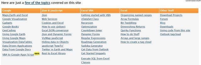 This site is all about how to free your Excel data from your desktop and take advantage of web capabilities such as Docs, Maps, Earth , Gadgets, Visualizations and a whole bunch of other services . Along the way, you’ll see a few techniques, tips and tricks as well as fully functional sample applications in Vba and javaScript. All examples are downloadable here, and the code is unprotected and free for non commercial re-use.