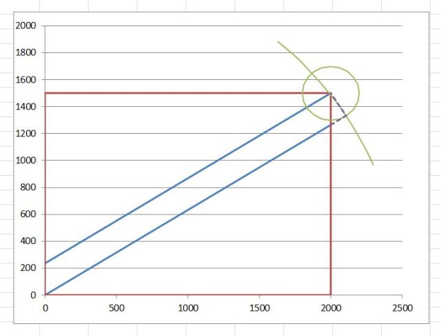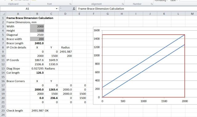 The end of the brace is then at the intersection of a circle centred at the bottom left corner, with radius equal to the brace length, and a circle centred at the top right corner, with radius equal to the brace width (green lines in the diagram). I already had a User-Defined Function (UDF) to find the intersection point of two circles, so it was a simple matter to copy the code into a new spreadsheet, and set up the required input and length calculations.