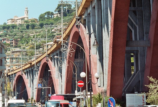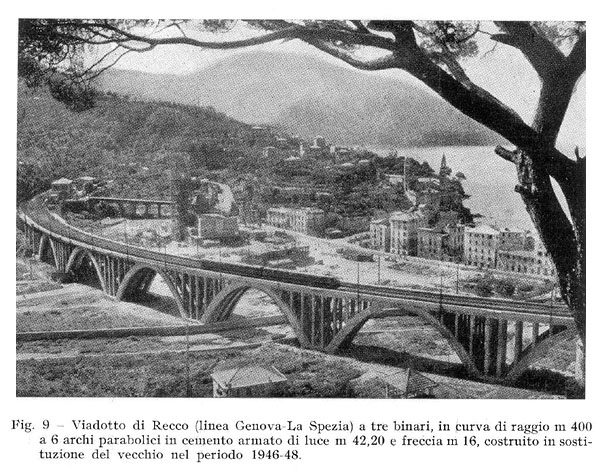 The Recco Viaduct (line Genoa-La Spezia) was rebuilt in 1946-48 with 6 parabolic arches on a curve of 400 m radius. Thanks to its design qualities and to the importance of the railway line, it can be assumed as one of the symbols of the reconstruction.