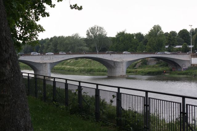 The Ponte Alla Vittoria is a 3 span bridge with flat concrete arches. The original bridge on this site was also a steel suspension bridge. The new bridge has an unusual strongly shaped deck, merging smoothly into the concrete piers: