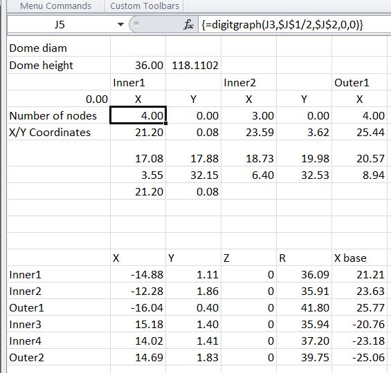 Having found the coordinates of three points on each surface the UDF ArcCenP3, from the IP2 spreadsheet, was used to find the centre and radius of the arc passing through these points. The thickness of each shell was also checked from the DigitGraph sheet, and the results were cross-checked against a similar analysis using a photograph of the exterior of the dome: