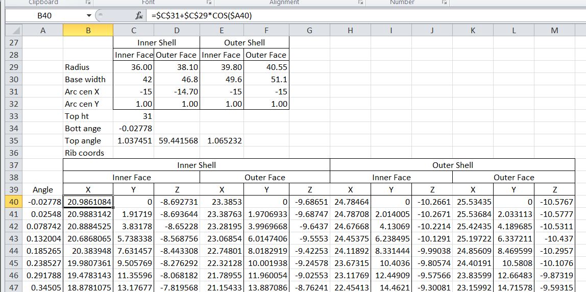 This data was used to determine the arc centre and radius data shown below, which was in turn used to generate the 3D coordinates of 21 points along the edge of a segment of the dome: