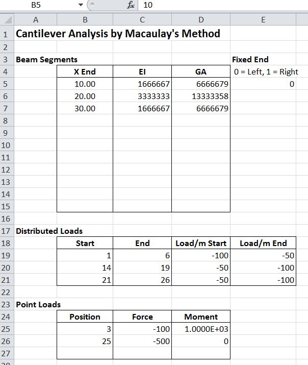 At the end of last year I updated the Macaulay spreadsheet to include shear deflections for continuous beams, but this facility was not added to the Cantilever function. That has now been fixed in the latest version, that can be downloaded from: Macaulay.zip.