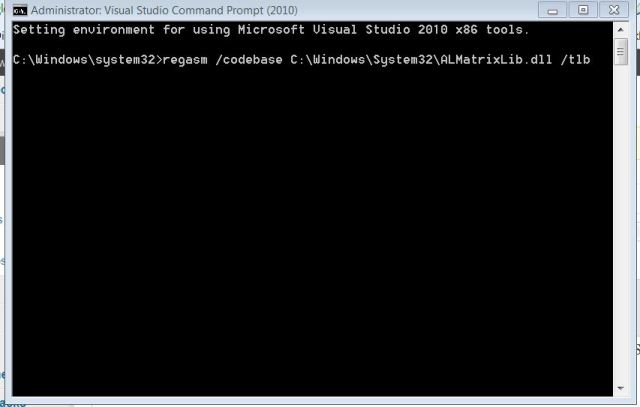 - Enter (with the path amended as required) : regasm /codebase C:\Windows\System32\ALMatrixLib.dll /tlb