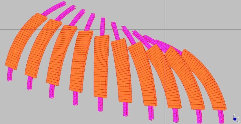 The arch on the left is parallel to the X axis, and all the beam members are oriented as intended, but as the angle of the arch vertical plane is rotated through 90 degrees, the angle of the principal axes is also rotated, which is not what is required.