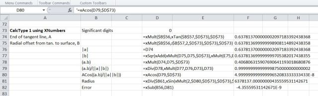To compare the results of Method 1 with the same procedure using higher precision arithmetic I have installed the latest XNumbers package (6.05.5M) which can be downloaded from http://www.thetropicalevents.com/Xnumbers60/. This package is based on the original XNumbers, but has been modified for Excel 2007 and later and improved performance.