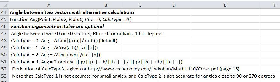 Further to comments by Georg under: The angle between two vectors, in 2D or 3D I have added four alternative ways of calculating the angle between two 3D vectors to the VectorFunc spreadsheet. The new version can be downloaded from: http://interactiveds.com.au/software/VectorFunc.xlsb.